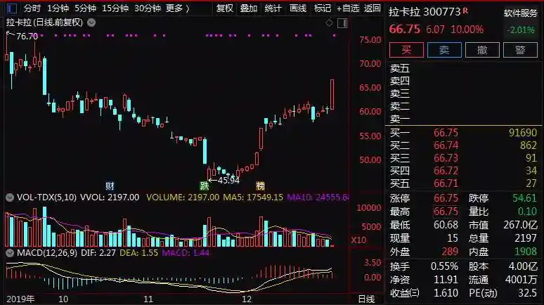 受拉卡拉的利好公告影响,拉卡拉公司股价在12月27日午后强势崛起,盘中直线拉上涨停板。