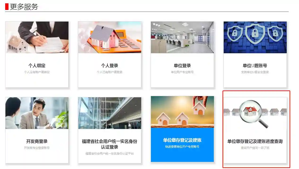 1、打开福州住房公积金网上办事大厅,在“更多服务”中选择“单位缴存登记及建账”。如下图所示: