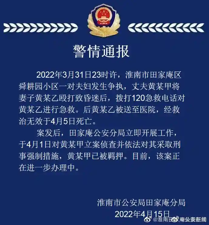 3月31日,安徽省淮南市田家庵区某小区一对夫妇发生争执,丈夫黄某甲将妻子黄某乙殴打致昏迷。后黄某乙被送至医院,经救治无效于4月5日死亡。案发后,警方立即开展工作,于4月1日对黄某甲立案侦查并依法对其采取刑事强制措施,黄某甲已被羁押。目前,该案正在进一步办理中。(北京青年报)
