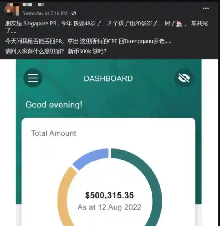 “他今天问我是否能丢回PR,拿出这里所有的公积金(CPF)回登嘉楼养老,请问大家有什么意见呢?50万新元够吗?”